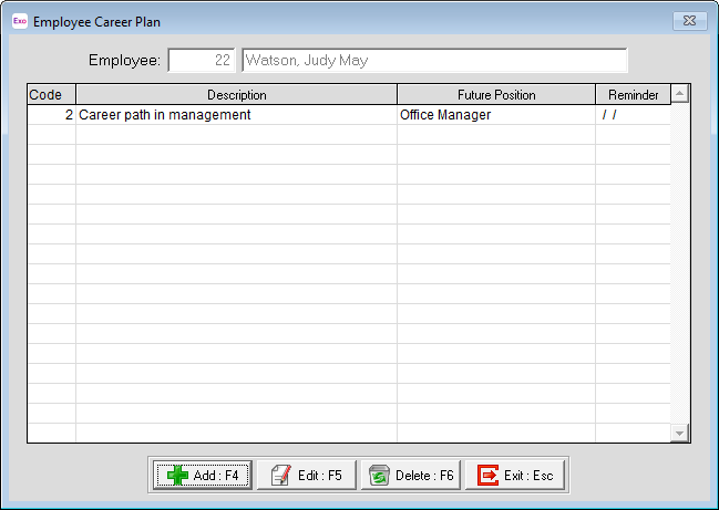 Access an employee's plan for career advancement by clicking the Career Planning button on the Other tab of the Employee Maintenance window.