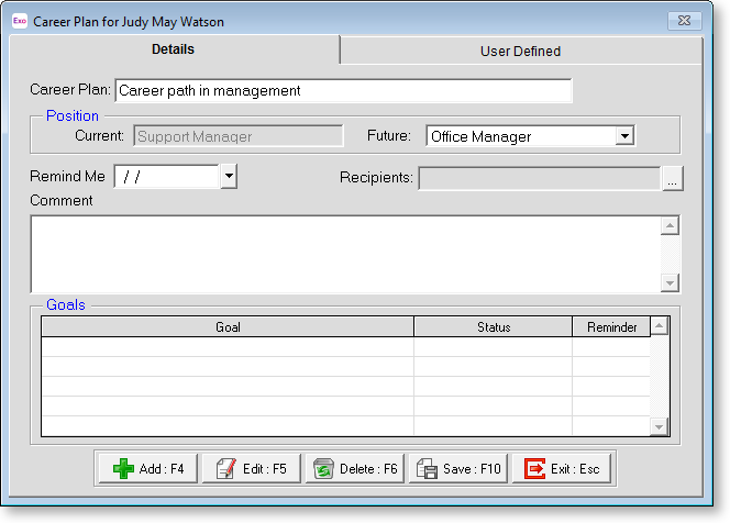 Goals Add Career Plan Goals and enter any additional information. To add a new goal, click the Add button or press F4 to display a list of Career Plan Goals to select from.