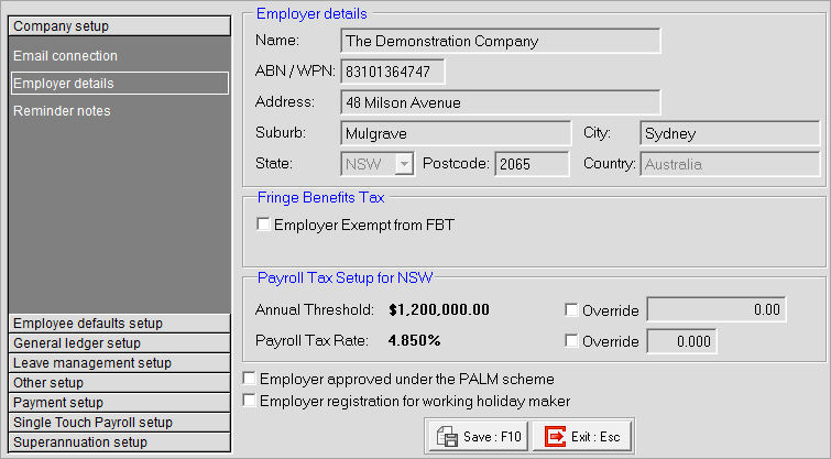 The address and contact details here identify the business entity for which this payroll company has been created, and will appear on the PAYG Payment Summary report.