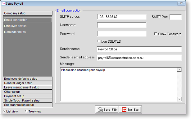 MYOB Exo Payroll has the ability to send payslips to employees electronically as PDF files. Providing that a significant number of your employees have access to their own computers and email accounts, and are not paid by cash, this may offer some long term financial savings in Payroll administration costs, as there is no expenditure or stocktaking involved for printers, payslip paper, ink cartridges, envelopes, postage, etc. Payslips are password-protected so that only the intended employee can read the file. The Email connection sub-section is where you specify the email details for your company.