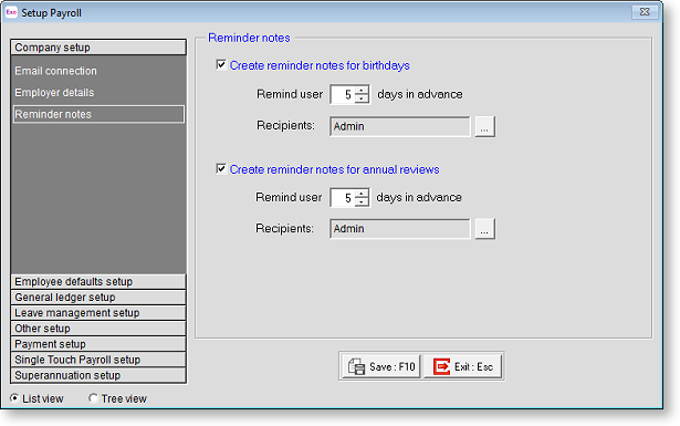 Most reminder notes are entered manually for each employee. However, some reminder notes can be automatically generated. Two common events that occur at regular intervals are birthdays and annual reviews. Setting advance warnings of these events can result in more preparation time. For example, one evening to purchase a birthday gift, or one week to complete an annual review.