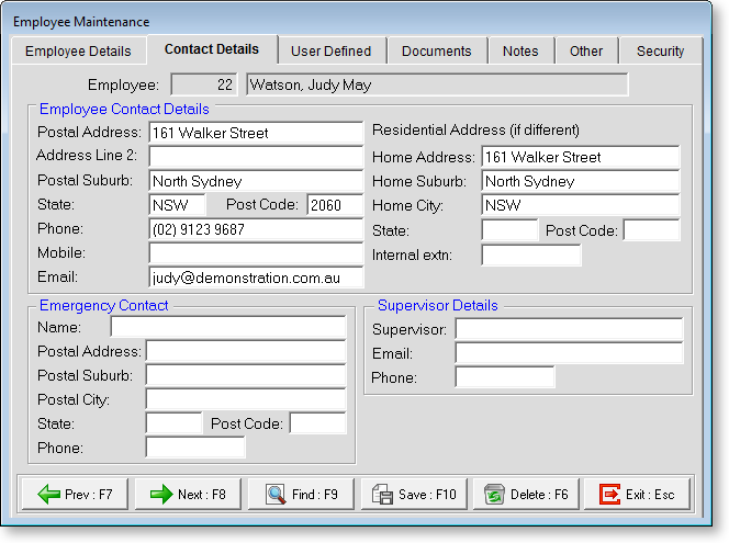 The Contact Details tab of the Employee Maintenance window holds contact details for the employee. The employee's contact details are added from MYOB Exo Payroll if the system is being operated as an integrated system. However you will need to enter the additional information such as the employees cell phone and email address if applicable.
