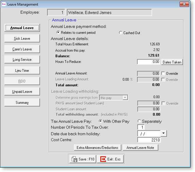 Cost Centre This field is used if you want this Annual leave to be costed to a different Cost Centre other than the default Cost Centre specified in the Leave Management Setup section of the Payroll Setup window or the employee's default Cost Centre.