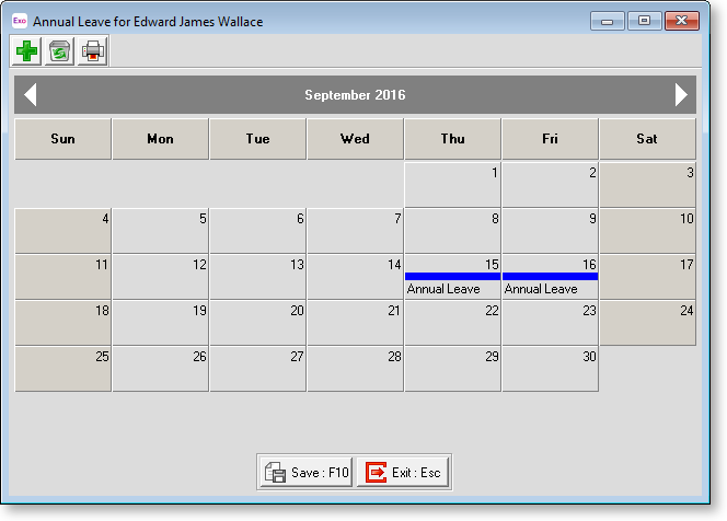 To colour a cell, click on the appropriate day. To print the calendar month for the current employee, click on the Printer icon from the toolbar at top left. Click Save or press F10 to save your changes and return to the Annual Leave window.
