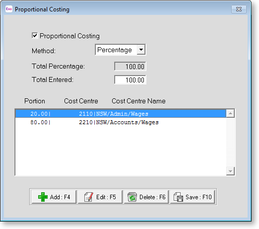 Default costing is set up in the Standard Pay. If you want to alter either the hours or percentage for this pay period, or if you want to change whether or not the employee's pay is proportionally costed this pay period, click the Costing button on the Current Pay window to open this window.