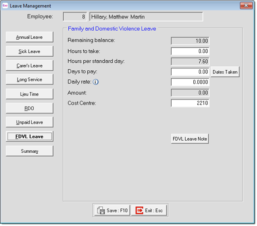 The Leave Management button the Current Pay window opens the Leave Management window. This window is for paying all types of leave, plus any full Rostered Days Off that the employee has accrued. Note that the system will suggest a dollar value of leave for waged employees but will not suggest a value for salaried employees. Whatever you pay out will be reduced from the available leave once the Current Pay has been updated.