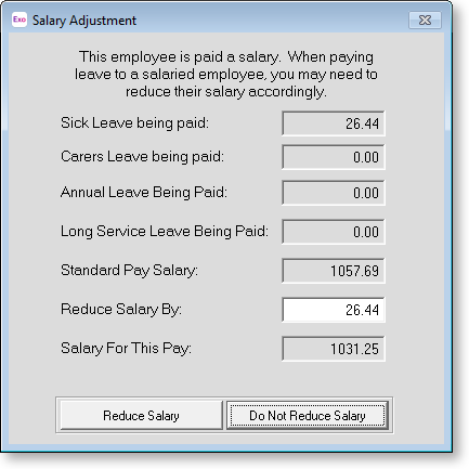 For salaried employees, Exo Payroll will automatically reduce the salary after you add a Sick or Annual Leave amount. You are asked to confirm this: