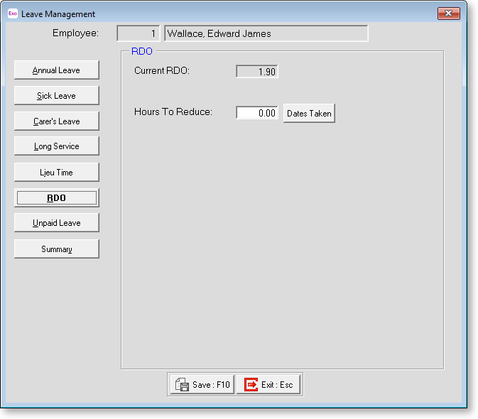 When you click Save or press F10 to save from the RDO window, a wage line is inserted into the Wages window representing the specified hours of RDO paid, at the employee's current hourly rate.