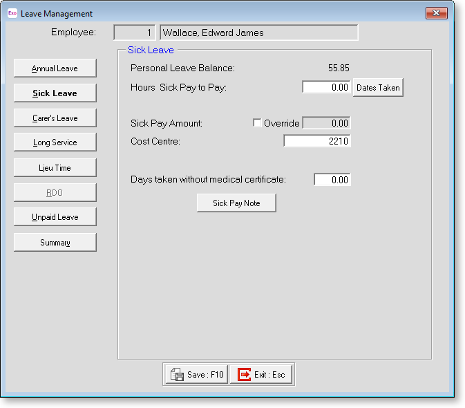 Cost Centre Although sick pay is automatically costed to the employee's default Cost Centre, this field allows you to cost the sick pay value to a different Cost Centre.