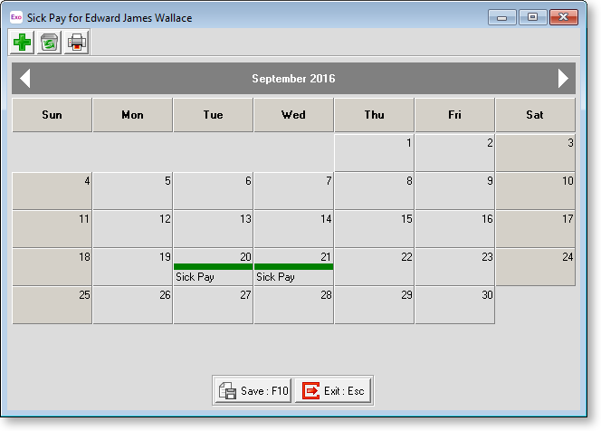 To colour a cell, click on the appropriate day. Click Save or press F10 to save your changes and return to the Sick Pay window.