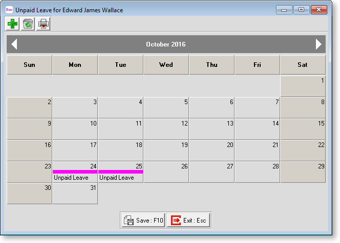 Click the Unpaid Leave button on the Leave Management screen to record unpaid leave in an employee's Current Pay.