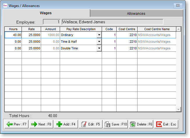 If you want to add a new Wage line click Add or press F4 and follow the same steps you performed when setting up the Standard Pay.