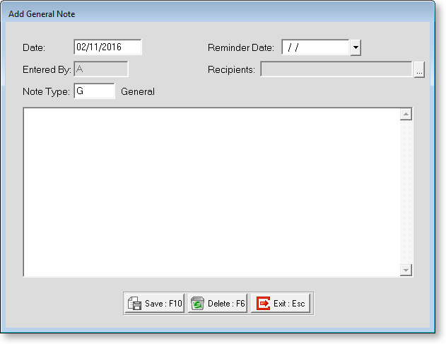 From the Notes Tab, click Add or press F4 to add a Note. The following screen appears.