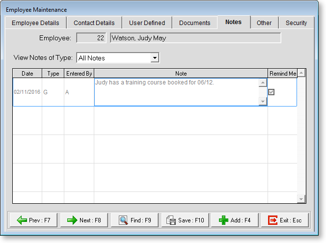 Notes can be entered or edited from the Notes tab of the Employee masterfile screen, by selecting Employee Notes from the File menu or by pressing F12 anywhere in the program.