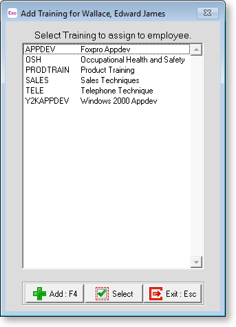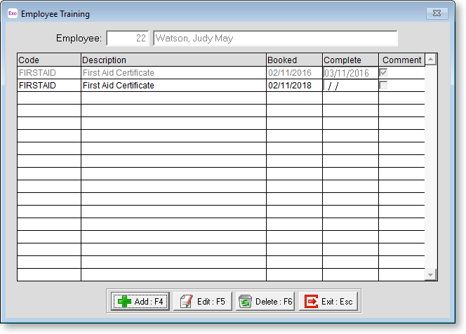 Access the record of an employee's training courses by clicking the Training button on the Other tab of the Employee Maintenance window.