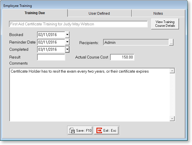 Actual Course Cost Enter the actual cost of the course, as opposed to the course value entered at on the Training Courses Maintenance window. This can cover circumstances where you get a group discount or if you need to account for accommodation or travel costs.