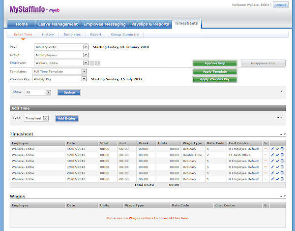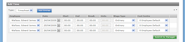 If you are logged in as a manager, you can add entries for other employees and approve pending entries; otherwise you can only add entries for yourself.