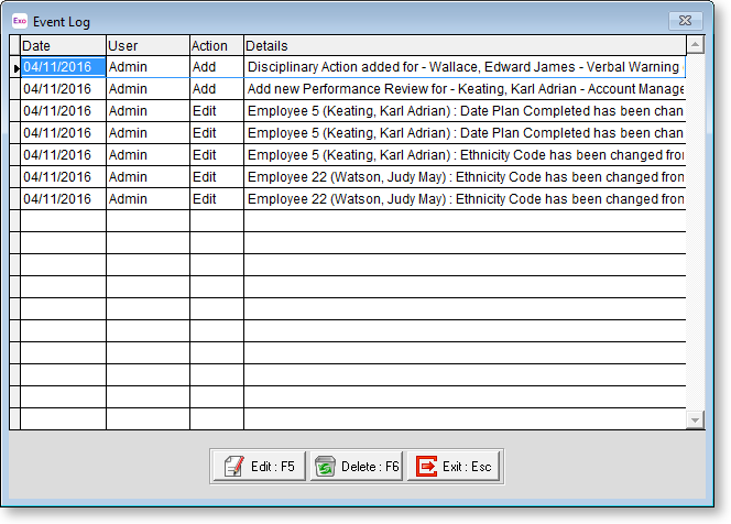 MYOB Exo Employee Information can be set up to keep a log of the following events: