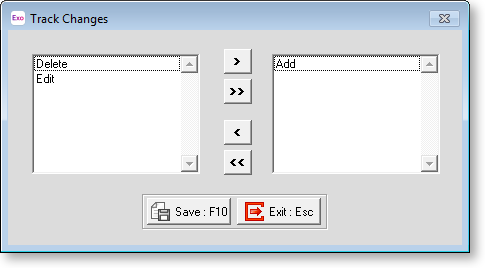 Events listed on the left are not tracked in the Event Log; events listed on the right are tracked. Select an event and click the > button to add it to the list of tracked events on the right. Select a tracked event and click the < button to remove it from the list of events being tracked. The >> and << buttons move all events from one list to the other. Click Save when you are done.