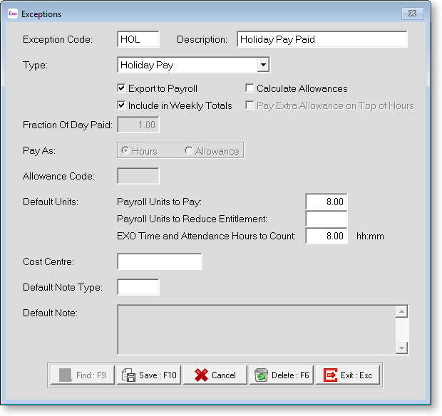 Default Note Type If you are using Exception Codes to tag a day for generating an Automatic Note enter the Note Type Code here (Refer to Note Types for creating new Note Types). Having entered a Note Type code you can also add a Default Note that will be recorded against an employee's masterfile every time this Exception Code is entered on a day for that employee.