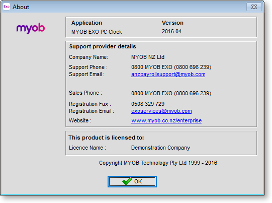 This screen displays the version number of Exo PC Clock and contact details for MYOB. If you have any questions regarding this screen, contact Support using the details displayed on this screen.