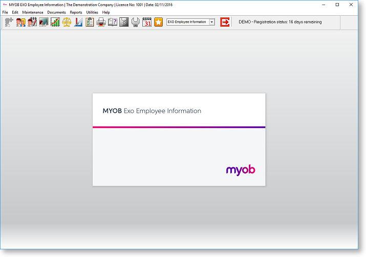 The first thing you will see is the MYOB Login Screen with the Demonstration Company in the list of payrolls. Exo Employee Information is a multi-company system (you can have unlimited additional companies). Once you add your own company, its name will appear in this list.