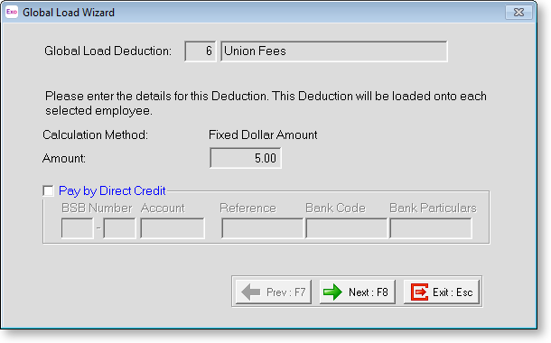 Amount If the amount field is blank and disabled, no fixed amount is applicable to this deduction. If the amount field is populated and disabled, the amount has already been set in the deduction masterfile. If you want to apply a different amount, you must use a different deduction code. If the amount field is blank and enabled, enter the fixed dollar amount that you would like to deduct for this Global Load.