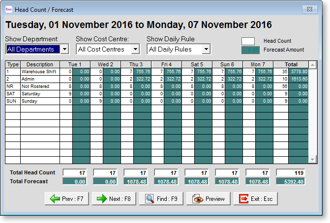 Select Head Count / Forecast from the Scheduler menu. The following window appears: