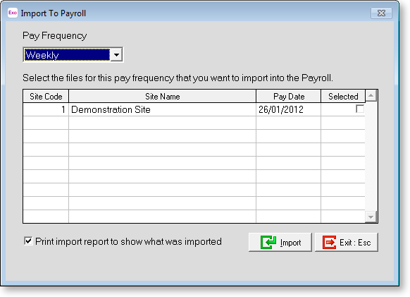 Import Clicking this button will post all selected files into the current pay for the selected pay frequency. If there are any discrepancies found during the import you will be warned and a discrepancy report will be printed. If all is OK, a confirmation message will appear.