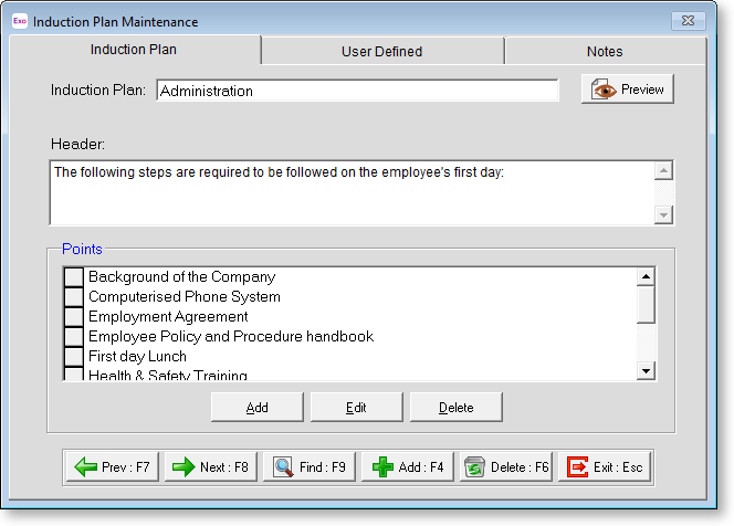 MYOB Exo Employee Information gives you the ability to design your own induction processes; it is possible to have any number of Induction Plans prepared on your system, which can then be assigned to employees when they start with your organisation. Induction Plans involve a selection of Induction Points, which define the individual steps or questions involved in the process.