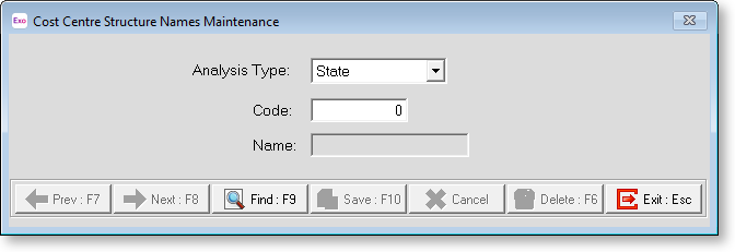Code Type in the code you wish for this level of the cost centre structure, up to 12 digits (999999999999) in length. Remember to follow the structural limits that you have predefined in the Cost Centre Structure Setup screen.