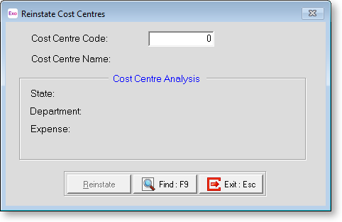 This reinstates cost centres which have previously been deleted from the cost centre masterfile. It does not reverse the action of "Deleting All Exo Time and Attendance Costing". Press F9 for a cost centre picklist, select a cost centre then click Reinstate.