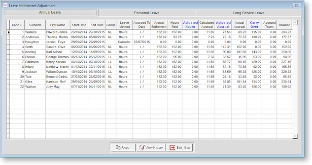 The utility displays the current YTD leave entitlements for all employees. Only the Adjusted Hours, Adjusted Accrual and Carry Over columns are editable - enter values into these columns to adjust employees' entitlements as necessary.
