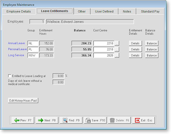 These three lines let you set up this employee's leave entitlements. The following properties are available for each leave type.