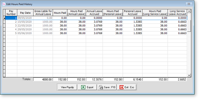 Edit History Hours Paid Because leave is accrued on the employee's actual hours, it is important that the hours recorded for each pay are correct. If you found that you have made a mistake in a previous pay, you can correct it in this window.