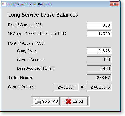 16 August 1978 to 17 August 1993 Long Service Leave only. Accruals between 16 August 1976 and 17 August 1993 that have not yet been taken by the employee. If you are new to this system it is important to load any entitlements still owing from your previous records.