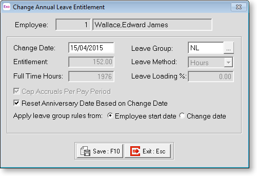 This window is available for Annual Leave and Personal Leave only. Leave groups for all leave types can be changed by entering a new entitlement on the <span class="NoteLink">Leave Entitlement window</span>.