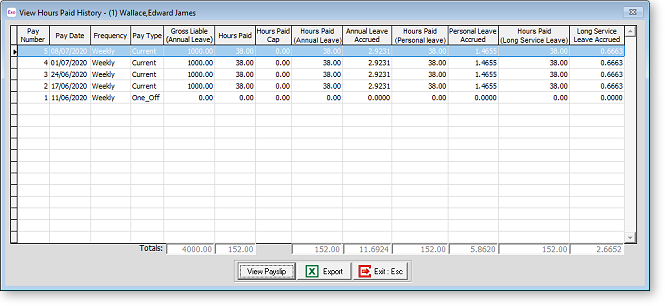 View Hours Paid History This button opens the View Hours Paid History window, which displays read-only information on the employee's leave accrual history.