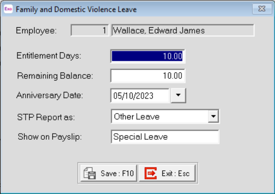 These four lines display this employee's entitlements for annual, personal, long service, and family domestic violence leave (FDVL). The following properties are available for each leave type.