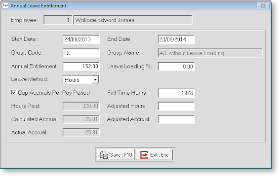 The Leave Method, Leave Loading % and Cap Accruals Per Pay Period options are taken from the employee's leave group; they reflect the leave group's settings at the time the employee was added to the group. It is possible that the leave group has been edited since the employee was added, in which case the settings displayed here could differ from what is currently in the group.