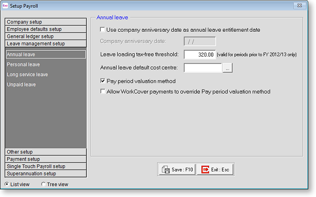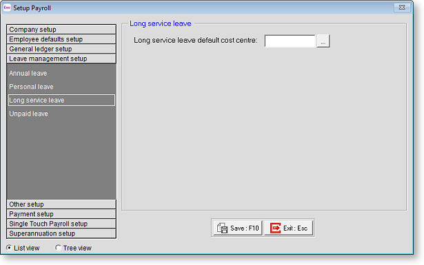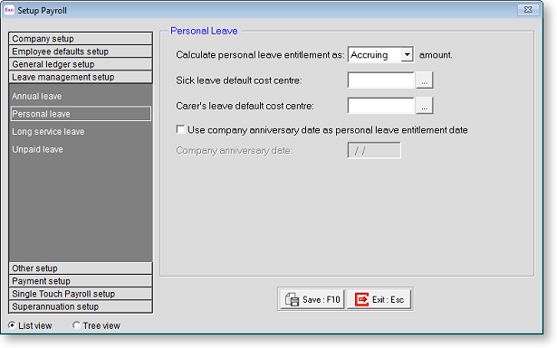 The Leave Management Setup section of the Setup Payroll window covers all types of leave, and deals with costing implications, units of measurement, entitlement dates, accrual calculations, and many other aspects which should be considered carefully before pays are run. Leave settings are divided across the following sub-sections: