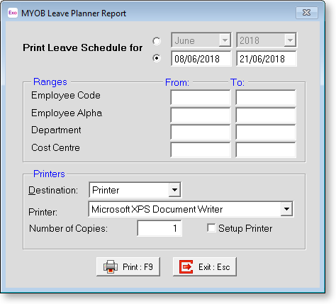 Print Leave Schedule for You can select an entire calendar month and year to print for, or alternatively you can specify an exact date range to report on.