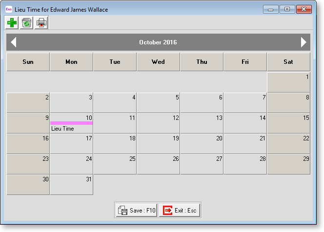 To colour a cell, click on the appropriate day. Click Save or press F10 to save your changes and return to the Lieu Time window.