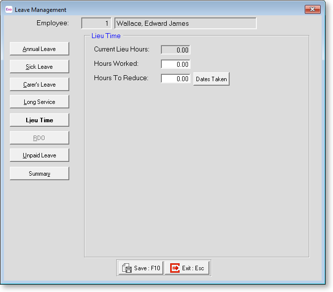 Hours To Reduce If the employee will be taking a Lieu Day (paid as wages) as opposed to being at work for a day, enter a value into this field. Also, you can click on the Dates Taken button, which brings up a calendar, from which you can specify which calendar days were taken: