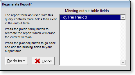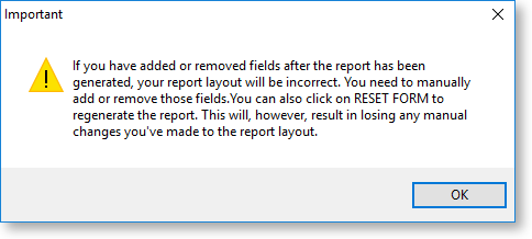 Customised reports must be kept in synch manually if you change certain aspects (such as the selected data items) later. If you take a report and customise the layout, and then add or remove data items from it, the Report Writer will notify you as follows: