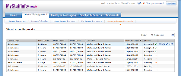 The Manage Leave Requests tab will be displayed for users who have been accorded a "Manager" status. Leave requests can be approved, subject to considerations such as eligibility, entitlement dates, and the current balance of leave. Leave requests can also be declined or deleted.