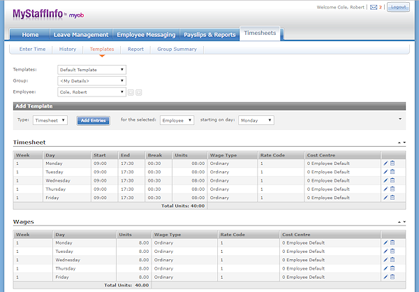 The Templates page is only accessible to users who have the Manage My Template and/or Manage Group Templates (Manager) security settings enabled in the MyStaffInfo Management Console. You can populate the timesheet with a pattern of default values that represent the employees' regular/rostered/contracted hours. A template may be used for any regular or irregular work pattern of any duration, providing that the work pattern can be predetermined. You can create templates for weekly wages, monthly bonuses, Christmas holidays, and so on.