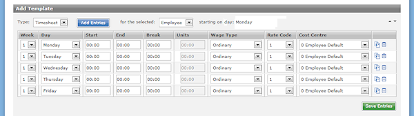 Exceptions are that no Employee is specified when editing template lines, and where timesheet entries require a specific Date, templates use a generic Week and Day combination.