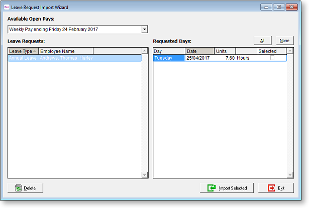 A list of permanent and casual employees, who have a paid on matching pay frequency, as set in Payroll in their Open Employee screen, and who have approved leave requests that are awaiting import, will appear in the left hand window. You can navigate to each employee by clicking on the appropriate grid line or by using the up and down arrow keys.
