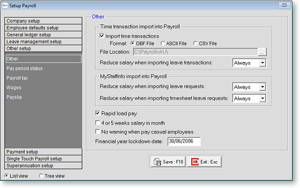 The Other Setup section of the Setup Payroll window contains additional settings that affect the operation of MYOB Exo Payroll. There are also options to enable certain advanced features, which would otherwise remain concealed. Settings are divided across the following sub-sections: